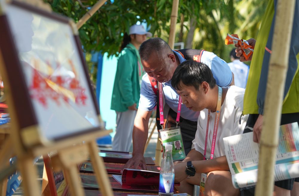 2024年11月26日,来自海南省乐东黎族自治县大安镇的林文生(左)在第十二届全国少数民族传统体育运动会民族大联欢活动现场为运动员介绍黎族剪纸艺术。新华社记者 晋美多吉 摄