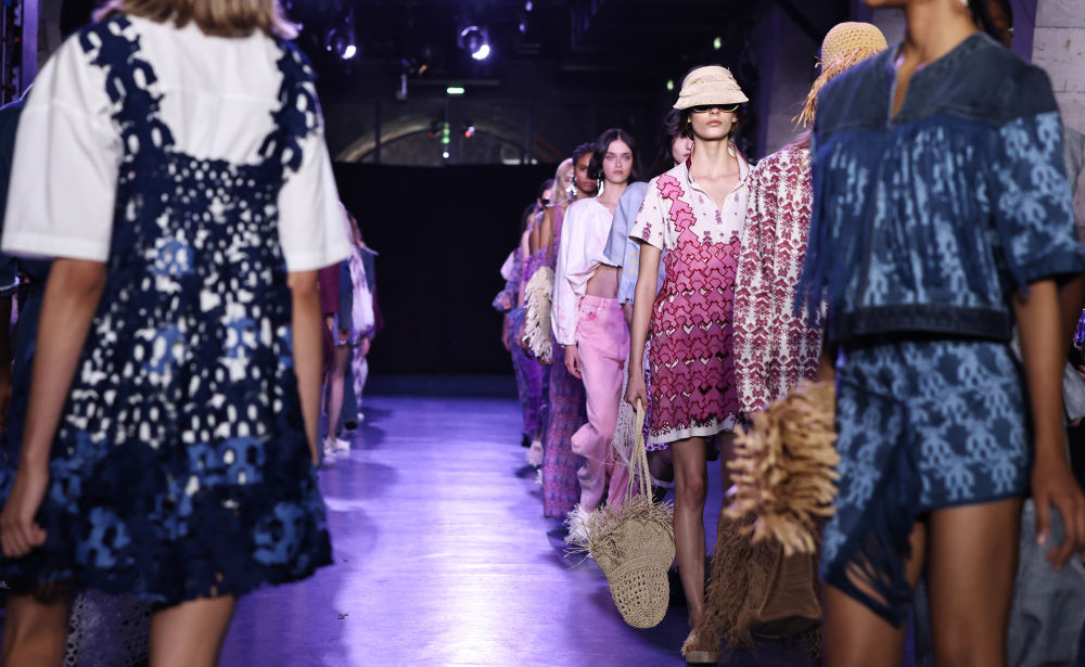 2024年9月27日,模特在法国巴黎举行的Vivienne Tam × 黎族2025春夏新品发布会上展示以海南黎锦元素为创作主题的服装。新华社记者 高静 摄