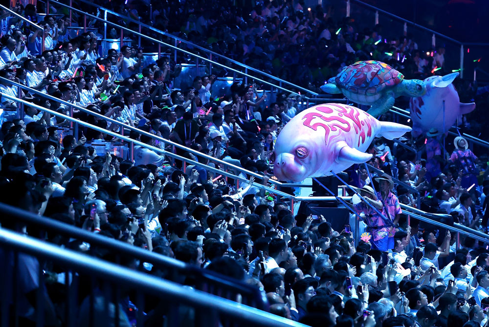 2026年4月22日,演员操作海洋生物模型在第六届亚洲沙滩运动会开幕式上与观众互动。新华社记者 张帆 摄
