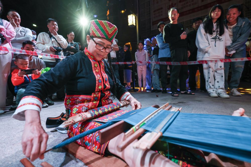 2025年3月30日,非遗传承人在海南五指山市举行的海南黎族苗族传统节日“三月三”主会场活动现场表演织黎锦。新华社记者 张丽芸 摄